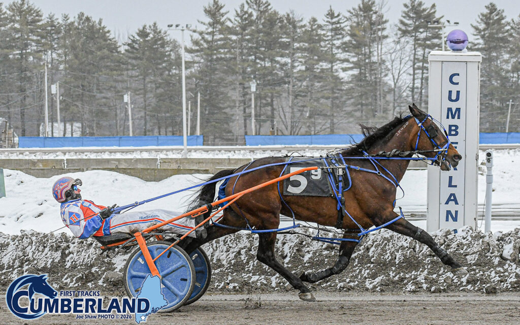 CUMBERLAND, ME – First Tracks Cumberland’s track crew cleared the nearly half-foot of fresh snow that had fallen on Sunday (March 22), forcing the postponement of that card to the following afternoon (Monday, March 23). Nonetheless, the track men and the horsemen and women were poised and ready for the second day of action in the state of Maine, which did not disappoint.