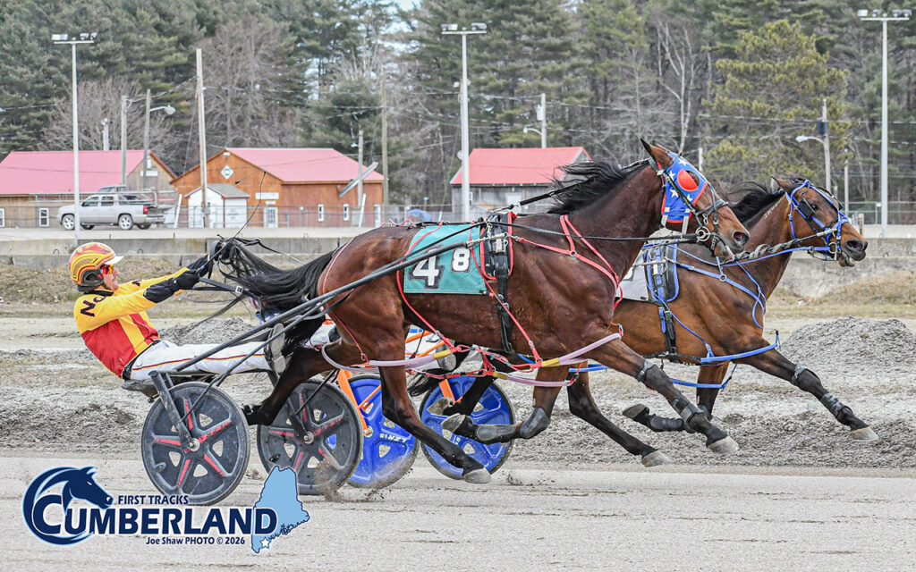 CUMBERLAND, ME – Nick Graffam orchestrated a mild upset on Sunday (March 29) at First Tracks Cumberland when he sat a patient, pocket trip with Varney to strike in the final strides and prevail by a nose over 1/5 favorite Alex Having Fun in the $7,000 winners over pace.