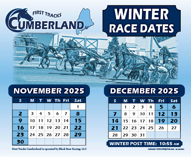 Racing resumes on Saturday (Nov. 15) at First Tracks Cumberland, with the Winter Festival extended pari-mutuel meeting continuing its weekend action throughout the month of November.  Cumberland Raceway will transition to three days of harness racing each week (Fri-Sat-Sun) beginning December 5.  The 18-day meet runs until Dec. 21, 2025.